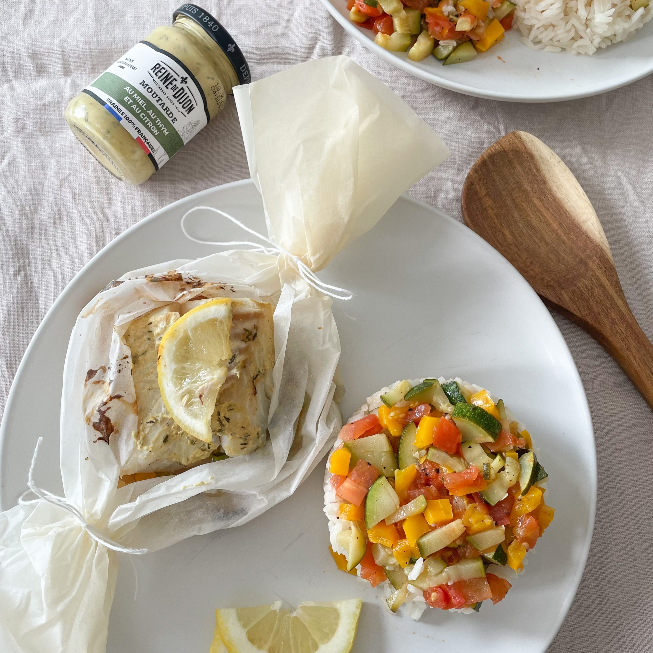 Sur une feuille de papier cuisson, placez vos légumes au centre puis ajoutez votre poisson et une tranche de citron. Refermez le tout en papillote.