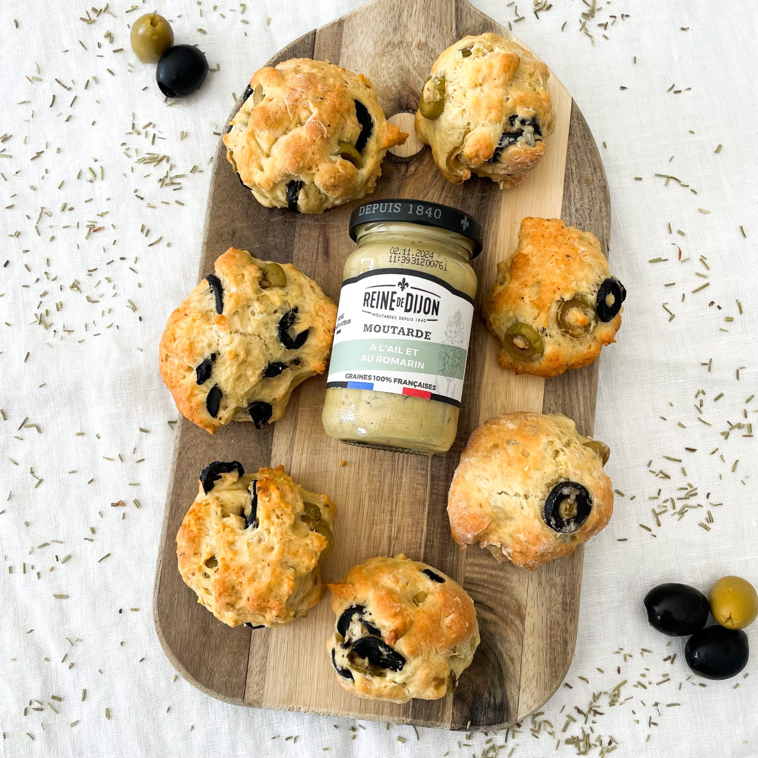 Ajoutez 4 cuillères à café de la moutarde ail & romarin, 1 cuillère à soupe de farine et les olives découpées puis pétrissez une dernière fois.