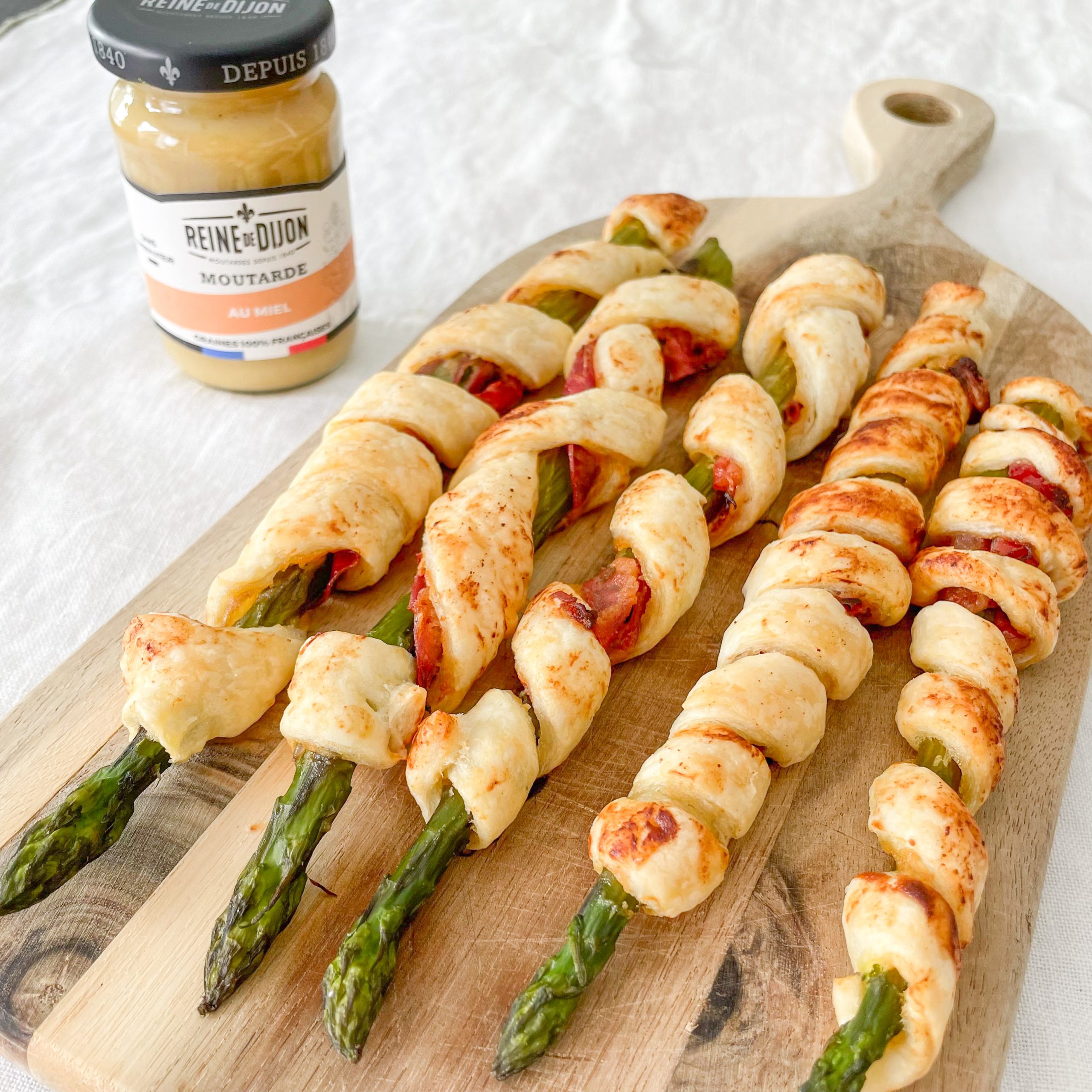 Enroulez une tranche de coppa autour d'une asperge puis découpez une fine bande de pâte feuilletée que vous allez enrouler autour de l'asperge également.